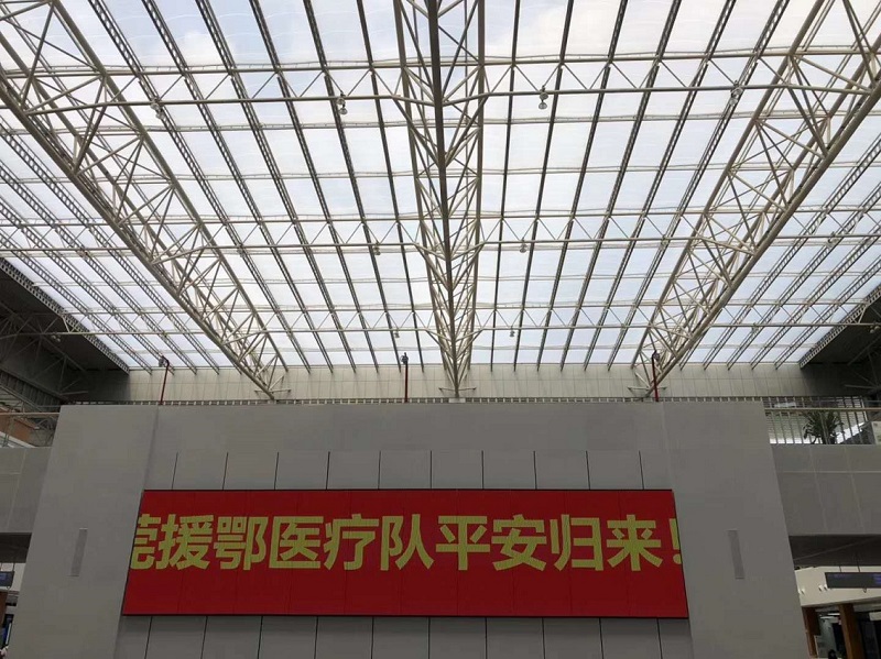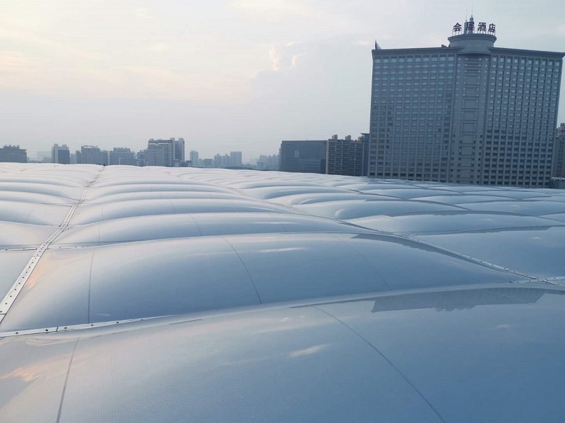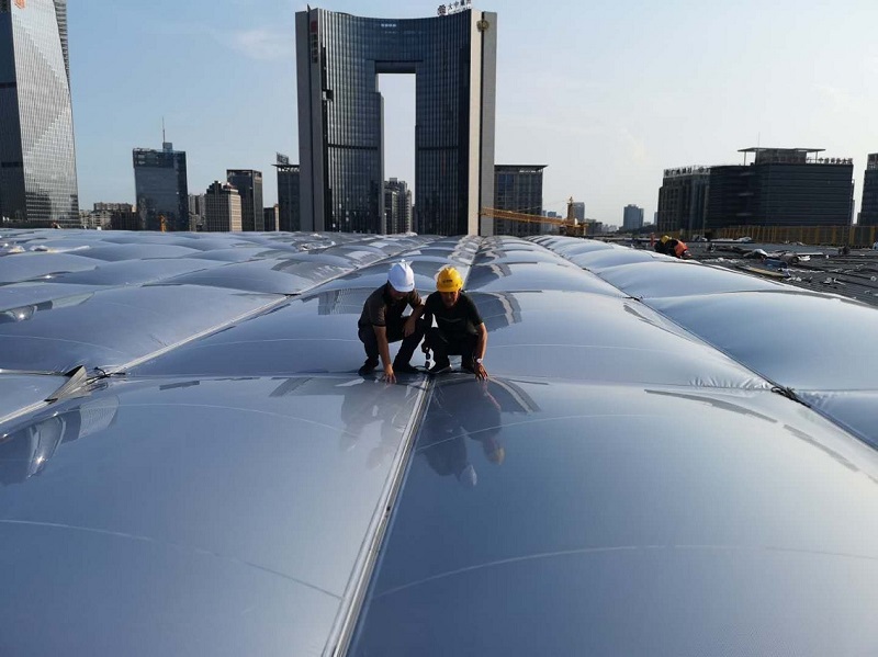 工程概況:東莞市民中心ETFE膜結(jié)構(gòu)氣枕屋面項(xiàng)目是廣東重點(diǎn)項(xiàng)目、大型市政單位提升改造工程,我們參與的內(nèi)容是將原本生銹腐蝕嚴(yán)重的金屬屋面拆除,然后替換成鋁合金邊框的ETFE氣枕膜結(jié)構(gòu)。本工程施工難度較大,全程需要計(jì)算機(jī)建模模擬,保證拆一處舊屋面馬上就能安裝對(duì)接新的氣枕膜單元,防止雨水進(jìn)入屋內(nèi)造成破壞。項(xiàng)目完工后,屋面環(huán)保美觀,極大提升當(dāng)?shù)爻鞘行蜗螅瑤?dòng)周邊商圈發(fā)展,東莞市長(zhǎng)特地對(duì)組織此事的業(yè)主方進(jìn)行了表?yè)P(yáng)。