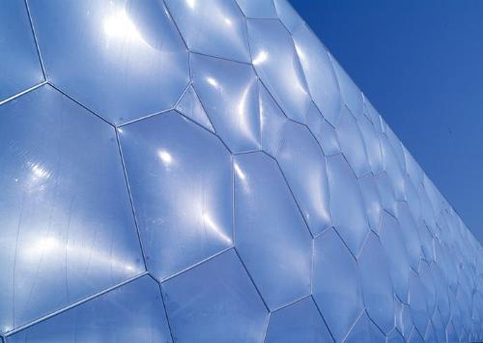 作為大型比賽場館的建筑材料用ETFE膜,更大的優勢還在于它們可以加工成任何尺寸和形狀,滿足大跨度的需求,節省了中間支承結構。作為一種充氣后使用的材料,它可以通過控制充氣量的多少,對遮光度和透光性進行調節,有效地利用自然光,節省能源,同時起到保溫隔熱作用。