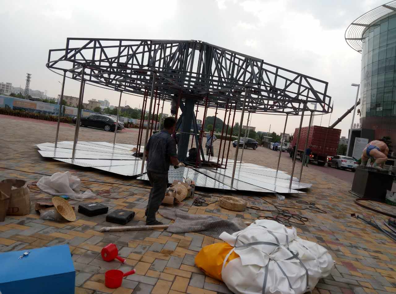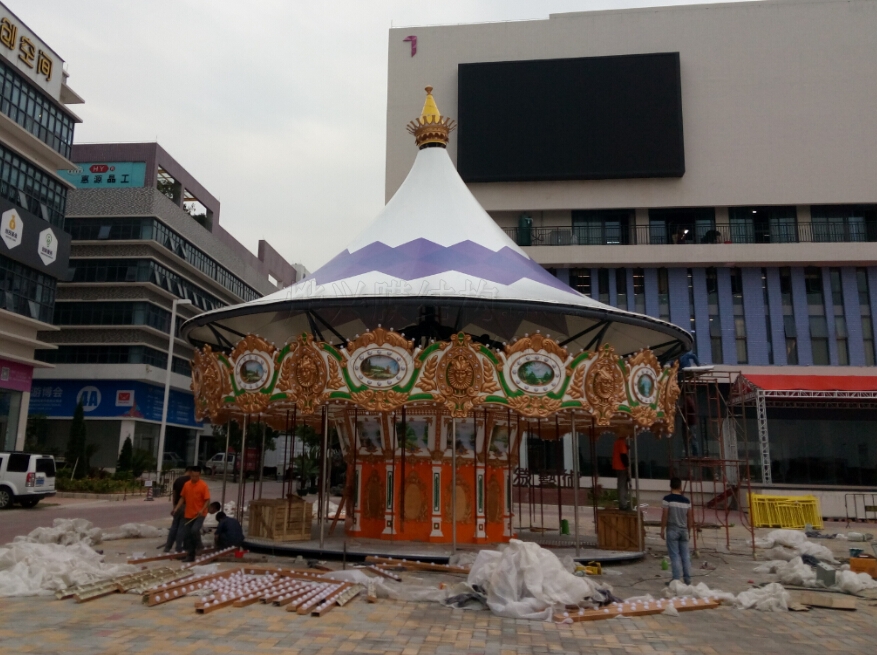 9月末,中山游樂場的相關人員找到我們公司,希望做一個膜結構棚頂的旋轉木馬。每一個旋轉木馬,都是游樂場最漂亮最耀眼的存在,但傳統的木馬設施,棚頂都是用普通彩色帆布來做,用一兩年就會褪色腐爛,這次中山游樂場采用我們的膜結構進行制作,看中的是膜材那長達15年以上的使用壽命和科學設計的鋼結構帶來的安全保障。
