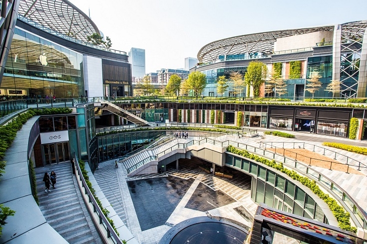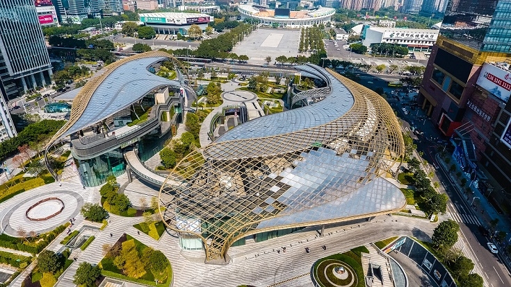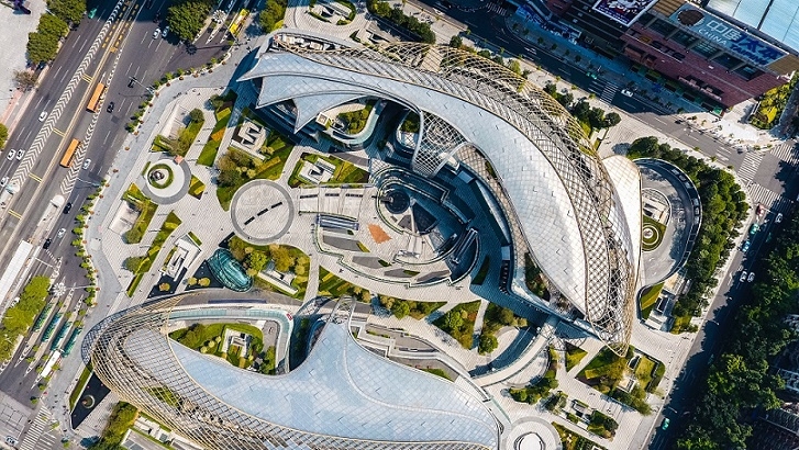 天環(huán)的建筑設(shè)計概念來自中國文化中象征著和平、和諧和財富的鯉魚,不銹鋼硬殼型結(jié)構(gòu)屋頂酷似兩條游動的魚,透明的ETFE膜是魚鱗。