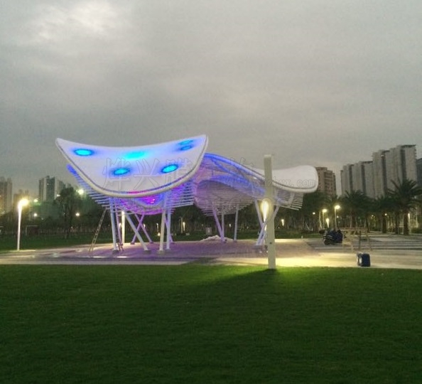 膜結構中,張拉膜造型多變,是最具藝術表現力的膜結構之一。梁祝化蝶的美麗神話,讓蝴蝶成為老少皆喜的小動物。當用兩只巨大而逼真的膜結構“蝴蝶”出現在你樓下的花園之中,是否感覺很清新很驚艷?
