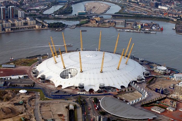 千年穹頂位于倫敦東部泰晤士河畔的格林威治半島上,是英國政府為迎接21世紀而興建的標志性建筑。彎項直徑320m,周圈大于1000m,有12根穿出屋面高達100m的桅桿,屋蓋采用圓球形的張力膜結構。
