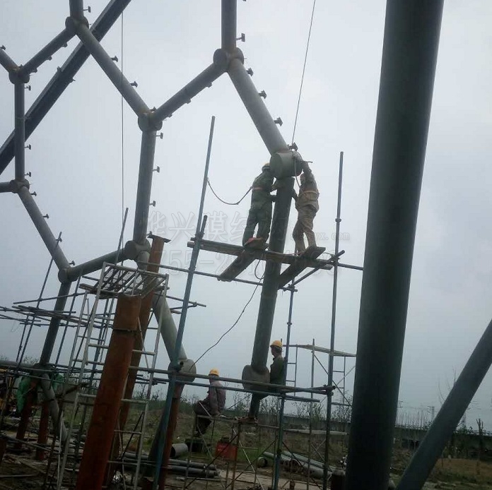 對連云港薔薇湖ETFE膜結構項目,我們燁興非常重視,現場施工人員一直都是滿編狀態。從照片拍攝的幾個角度來看,對3#球最后一圈桿件的吊裝和加焊是全方位排開進行的,人員馬力全開,力爭提前完工。
