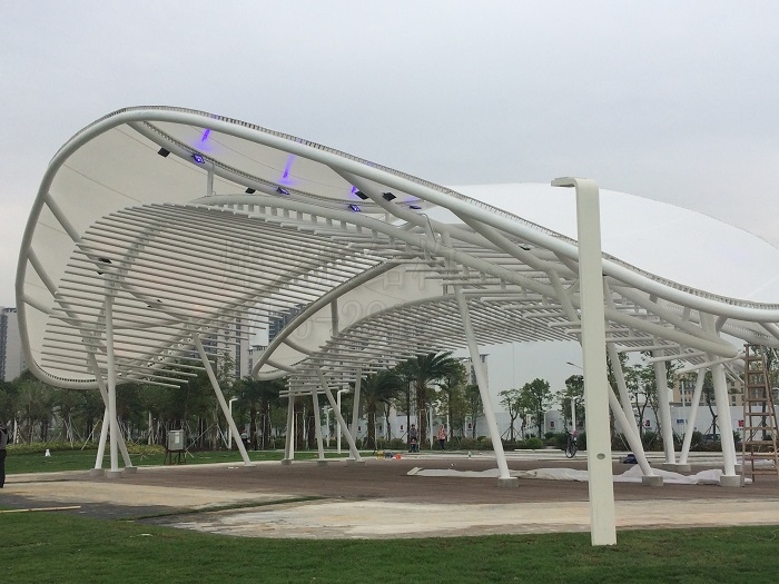 從建筑分類來說,膜結構是所有膜結構建筑的統稱,比如膜結構車棚、膜結構雨棚、景觀張拉膜、充氣膜、膜結構體育場館、膜結構沖浪池、膜結構崗亭等等,凡是用膜材料結合其它材料建成的建筑,都可稱之為膜結構。需要注意的是,膜結構是永久性建筑,一般都是基礎固定的。