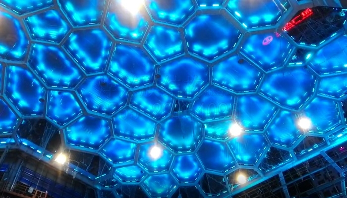 看到兩個出口處的膜結構立面,有沒有讓你想起什么?是不是和2008年北京奧運會的“水立方”國家游泳館的墻面結構有點相像?這就是ETFE氣枕膜的外形效果,高端大氣上檔次。
