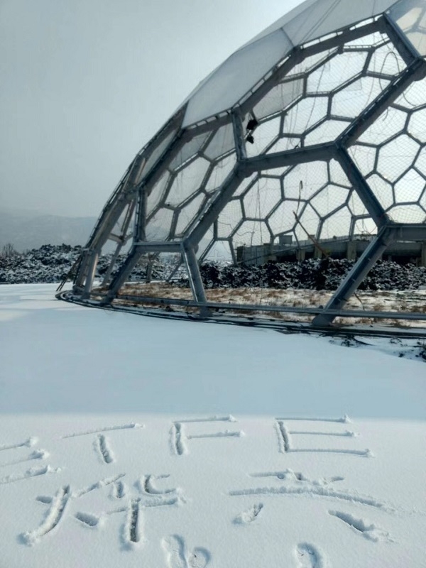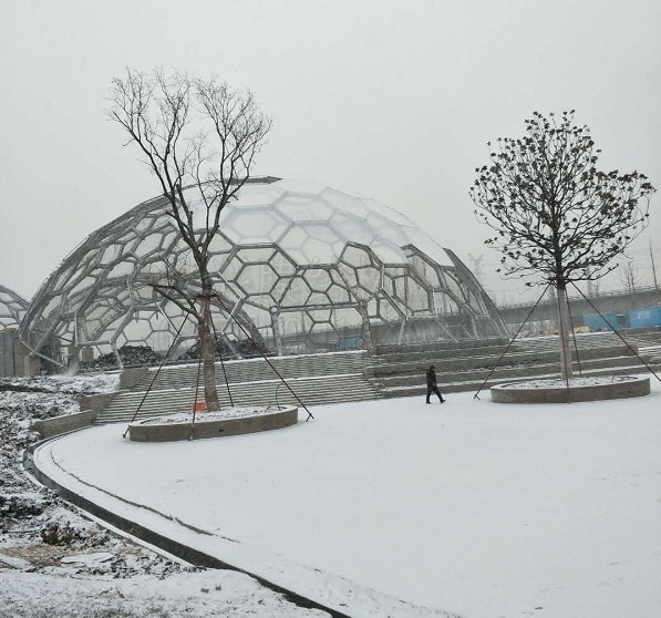 往日里熱鬧的ETFE熱帶植物園項目工地已經安靜下來,遠遠望去,三個巨大的鋼結構半球靜靜倒扣在冰天雪地中,已經開始裝膜的1#球頂部雪白,那是新裝的ETFE膜面攔住了積雪。雖未完工,但已經顯露出該有的壯觀宏大氣象。
