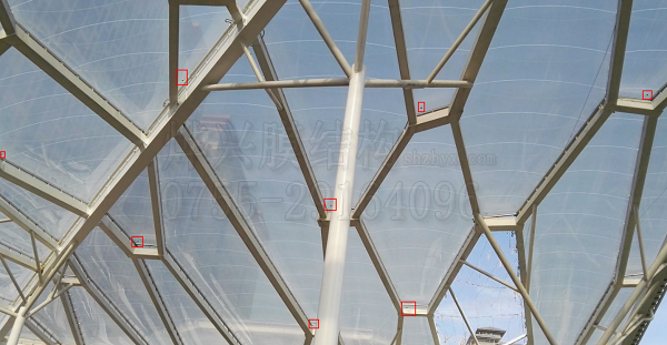ETFE膜結構最經典的應用形式是做成氣枕充當商業建筑的外圍護。氣枕內部保持干凈整潔是決定ETFE膜結構使用效果重要因素。氣枕內有水氣、浮塵都會嚴重影響建筑的美觀程度和使用壽命。在設計ETFE膜結構氣枕的時候,我們已經對可能出現的情況作出了一定的應對措施。首先,沖入氣枕的空氣需要是經過干燥的潔凈空氣,為此每一個ETFE膜結構氣枕工程,我們都會配備專用的高穩定性空壓機;另外,氣枕并不是完全密閉的,在每一個氣枕(靠建筑內側)都會安裝一個溢氣閥,在我們沖入空氣的過程中,氣枕內的一部分空氣客戶從溢氣閥流出,假如氣枕中因特殊原因跑入水氣或者浮塵,就能從溢氣閥循環出來。