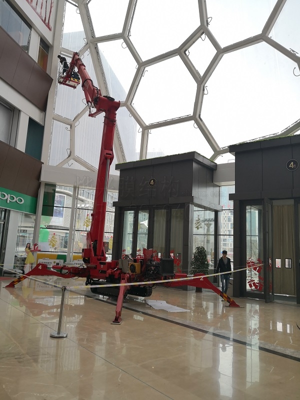 上圖為工人正在操作室內工程起降設備對ETFE室內里面進行清潔保養