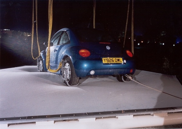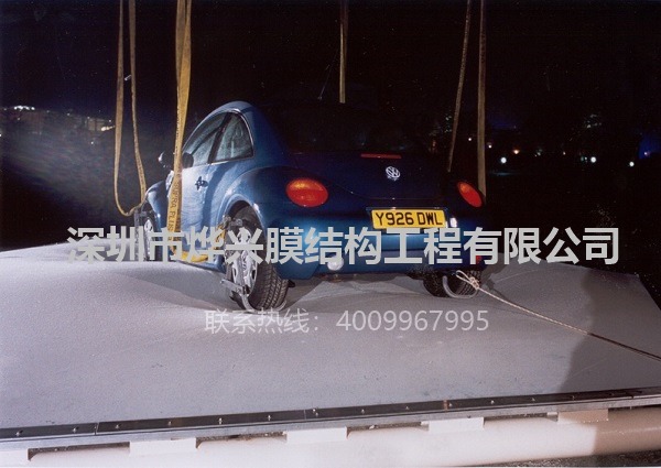 一般建筑用的ETFE膜只有200μm左右,但這薄薄一層透明膜材,其抗壓強度在40MPa以上,具有極強的抗撕裂能力,在不用尖銳物體戳碰的情況下,其物理性能媲美相同厚度規格的鋼鐵。我們做過試驗,在充氣后的ETFE氣枕膜能輕松將汽車托起并且膜材完全不受損壞;在單層膜實際案例中,沒有壓邊的情況下膜面也能正常站人(65kg),并且在人離開后膜材能完全恢復。