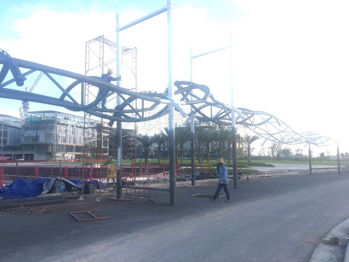 “玉龍出海”造型的長(zhǎng)廊采用骨架式膜結(jié)構(gòu),兩座膜結(jié)構(gòu)建筑總面積四百多平方米,體量雖小,但為了追求最好的工程效果,其鋼構(gòu)部件全部都在我們的鋼鐵加工廠經(jīng)過(guò)嚴(yán)格的加工工序精制而成,再運(yùn)輸?shù)浆F(xiàn)場(chǎng)進(jìn)行安裝拼接。如今雖然兩座廊橋的鋼結(jié)構(gòu)已吊裝完成,準(zhǔn)備裝膜。