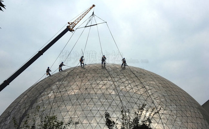 近日,數名“蜘蛛人”對中國科技館球幕影院的球面外墻進行高空清潔作業(yè)。作為資深膜結構行業(yè)從業(yè)者,看到這則報道的第一想法是——假如這個球面外墻是用我們的ETFE膜結構進展制作,是否這些清潔作業(yè)就不需要了呢?要回答這個問題,我們先來先弄清楚玻璃屋面與ETEF膜結構屋面的區(qū)別,一起來看一下吧。