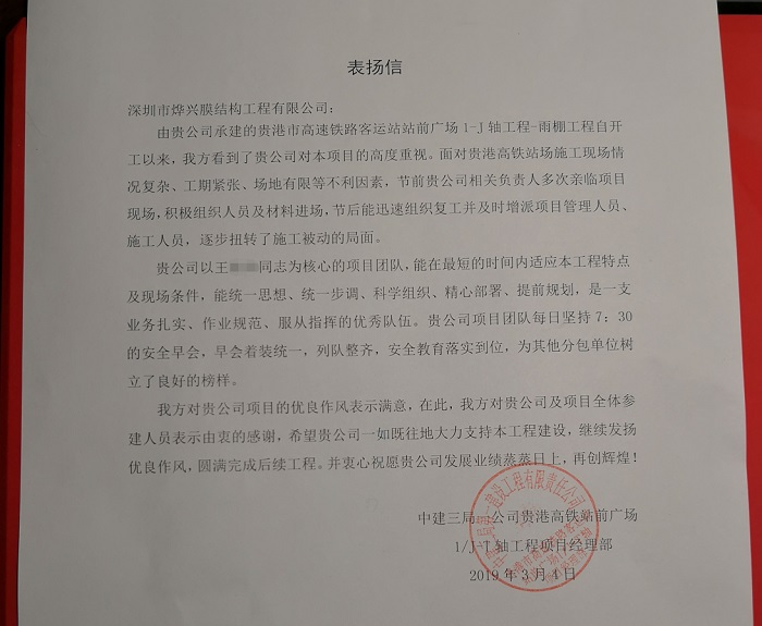 專注膜結構行業15年,在不斷優化成長的過程中,我們逐漸收獲業主和發包單位一些口頭的表揚和感謝!因為感覺自身還有很多不足需要改善,我們把這些表揚和感謝當做交際應酬中的善意釋放,直到近日,一封蓋著中建三局發包單位紅章的表揚信送到我們的手中。這是我們第一次收到中字頭發包單位自發行為的書面感謝信!這張樸實無華的A4紙看起來很單薄,但傳遞給我們的信息卻很有力量,這是對我們深圳市燁興膜結構工程有限公司實力的認可和優秀工作的表揚,我們努力了這么多年,終于迎來美好的收獲。今天是植樹節,種下努力的種子,收獲成功的綠洲!我想和您分享一下我們的喜悅。