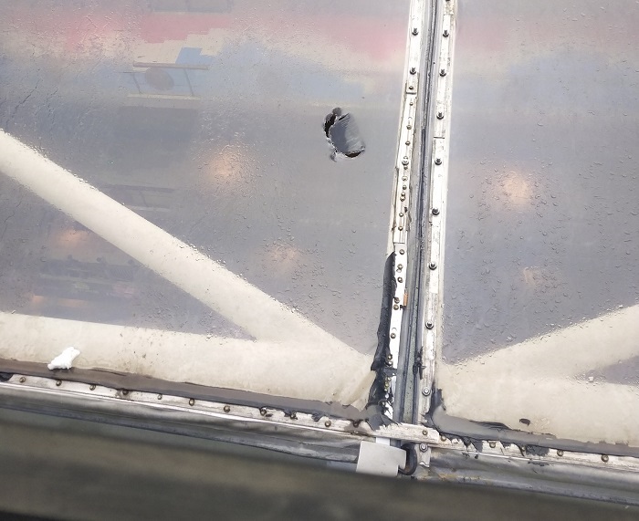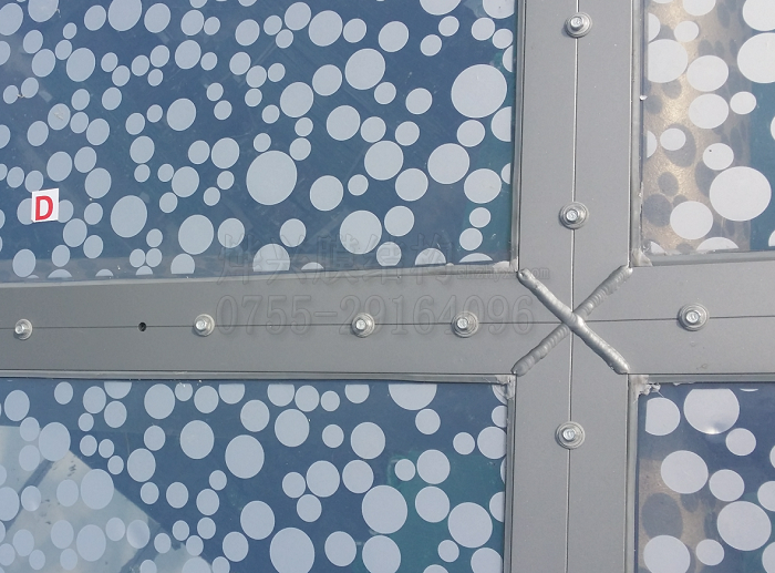 以上是某商業(yè)中心ETFE屋面的外觀圖。這是單層ETFE膜結構屋面,做成這樣的效果,原因是承建單位沒有ETFE膜結構的技術實力和施工經(jīng)驗,這是將安裝普通PVC膜材的壓膜方法生搬硬套導致的后果。外行人可能會覺得:看起來雖然不美觀,但從里面又看不到,不影響實際使用。而從專業(yè)角度來看,這樣的工程可以歸類為垃圾工程。上面的工程,有幾個明顯的缺點:1、使用不專業(yè)的壓膜方法,在膜面上開孔,降低了整個膜面的抗壓強度,雨水還可能通過螺栓處進行內滲,造成漏水和銹蝕破壞;2、使用普通膠水進行防水密封,ETFE膜材是不粘材料,膠水老化一段時間后,密封防水效果就會消失,進而出現(xiàn)內漏。從圖中也可以看到,屋面的低點應該已經(jīng)出現(xiàn)滲水現(xiàn)象,所以打了一層厚厚的防水膠,左側的壓膜板上的螺栓不規(guī)整且較密,那是因為滲水嚴重而臨時加固的。