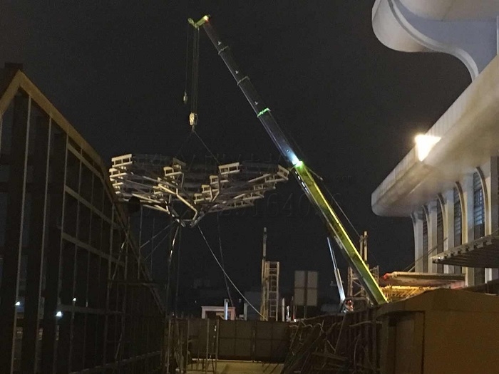3月22日凌晨4時,燁興-貴港高鐵站ETFE膜結構雨棚項目進行的鋼結構首吊順利完成。在此,對該項目吊裝過程進行回顧。