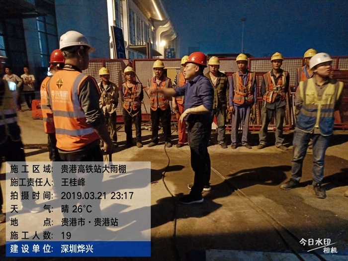 3月21日晚約10時30分,總工楊帆指揮雨棚吊裝人員各就各位。