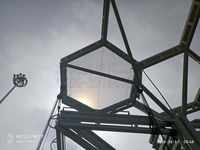 從上圖中我們可以看到,新裝的ETEF氣枕單元成型完美,外觀飽滿無褶皺,從地面往上看通透晶瑩,水泡感滿溢。另外,整個單元與底座高度契合,六角形的六個邊線鋁壓板與外圍邊框間隙邊線都相互平行。這些細節傳遞出了許多信息,一是我們的鋼結構加工符合工藝標準,二是我們現場的測量人員數據收集準確,三是ETFE膜裁剪加工沒有問題,只有全部參數都符合標準,才能做出這樣完美的ETFE氣枕。