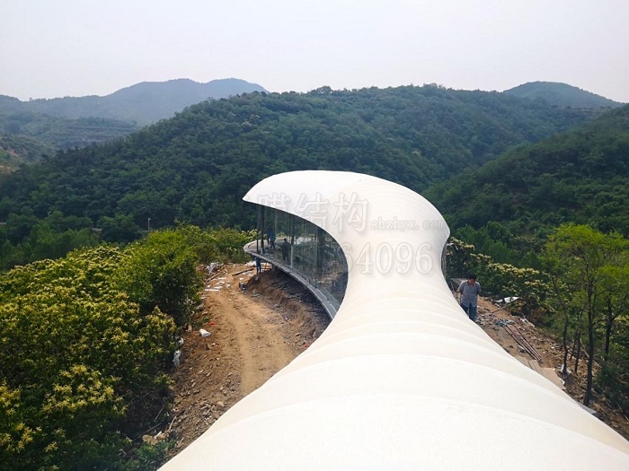 工程介紹:泰安書吧膜結構工程是一個集觀景、閱讀、休閑娛樂于一體的綜合項目,既有膜結構建筑本身的現代化氣息,又有設計者及建造者高超技藝賦予的精致典雅,給人一種時尚別致卻又內斂質樸的觀感。本工程建筑屋面為流線形,建筑面積約600平米。外膜采用德國進口白色環保膜材,內膜采用PTFE內膜,中間加保溫隔熱層,內膜需要安裝燈光。屋面以下為全封閉空間,墻體采用落地玻璃形式,從各個角度都能獲得極佳的視野效果