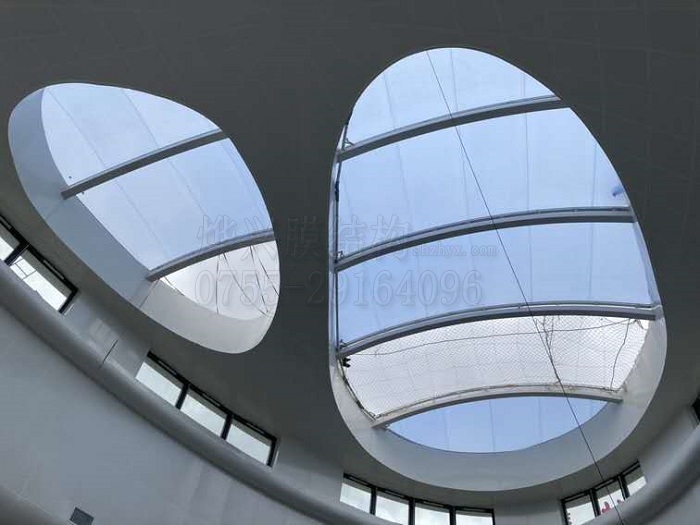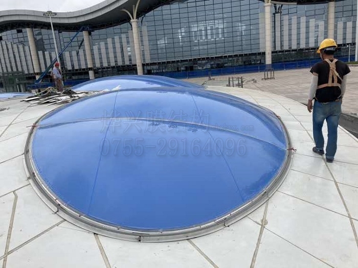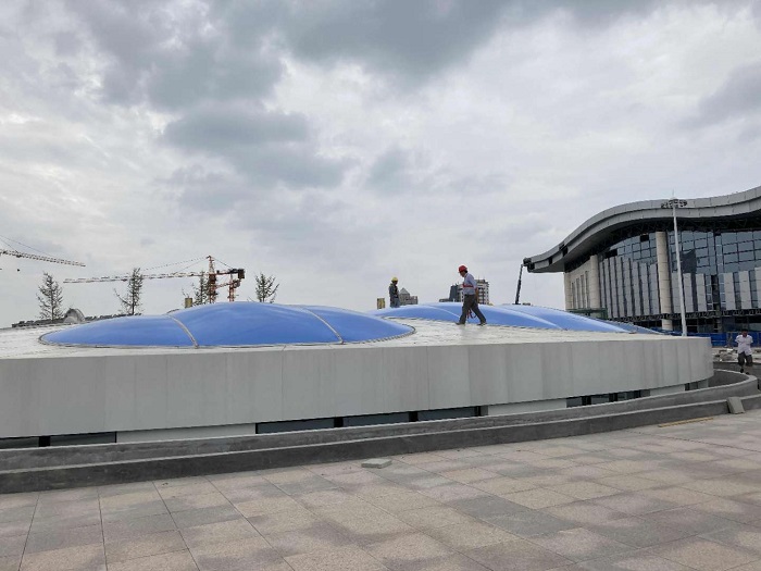 山東濰坊高鐵站ETFE膜結構裝飾屋面是一個有故事的項目,屬于高鐵站前的地下廣場的采光頂屋面。作為一個人流量巨大的高鐵站配套項目,需要考慮安全、環保、節能等因素,于是ETFE膜結構的制作方案很快就被各方認可。當初有人建議說要使用玻璃方案,但最終被否決了,原因是作為地下廣場的采光屋面,與外部地面基本平齊,用玻璃的話需要用較厚重的鋼化玻璃,需要投入更多的結構承重預算;玻璃只能做成平面的普通天窗,不能做出ETFE那種美麗的高弧度氣泡效果,高鐵站屬于地標建筑,需要美麗可靠的特殊建筑進行點綴。