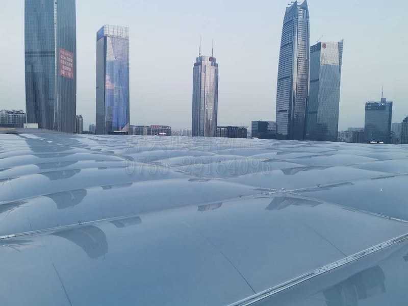 其次從結構形式上分,可將ETFE膜結構歸為兩大類:單層ETFE膜,雙(多)層氣枕膜。它們都需要采用專門的鋁合金支架進行支撐固定,并且根據一定規律分割成膜單元。單層ETFE膜外觀造型比較簡單,看起來和玻璃相近;雙(多)層氣枕膜需要使用專業的充氣系統進行智能充氣,保持膜氣枕鼓起,從而獲得立體的氣泡美感和良好的保溫隔熱性能。ETFE氣枕膜是目前最新奇炫麗的屋面形式之一,每個作品都成了吸引客流的城市地標。需要注意的是,ETFE氣枕膜屋面,一旦投入使用后,就必須保持充氣設備運行穩定,保證氣枕內的氣壓在設計要求值內。