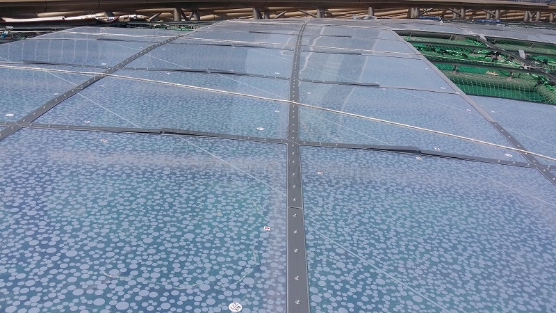 最后是ETFE膜材顏色,常規的有無色透明、淡藍、乳白色、透明加花紋鍍點等。膜材顏色方面,一般是根據項目追求的效果去選用。無色透明、淡藍、乳白色等,都是純色的,其透光度等性能都比較固定。這里主要說一下使用最廣泛的透明加花紋鍍點膜。在透明膜上增加花紋鍍點,目的是調節陽光的通過率,使屋面下的光照環境更舒適宜人。鍍點花紋的形狀、大小、排布間隔等,都是可以定制的,廠家現貨也提供多種常規選擇。雖然膜材上加了鍍點,但是當屋面離地面10米以上時,視覺中,鍍點屋面看起來幾乎是透明的。