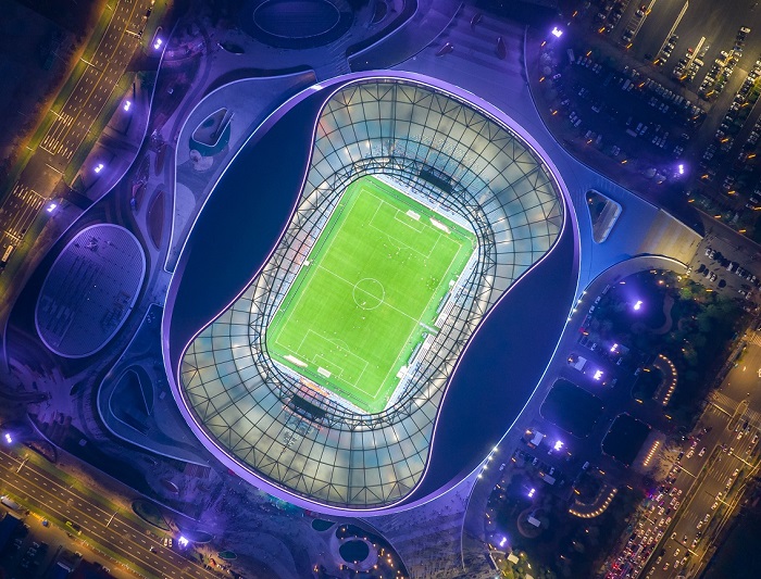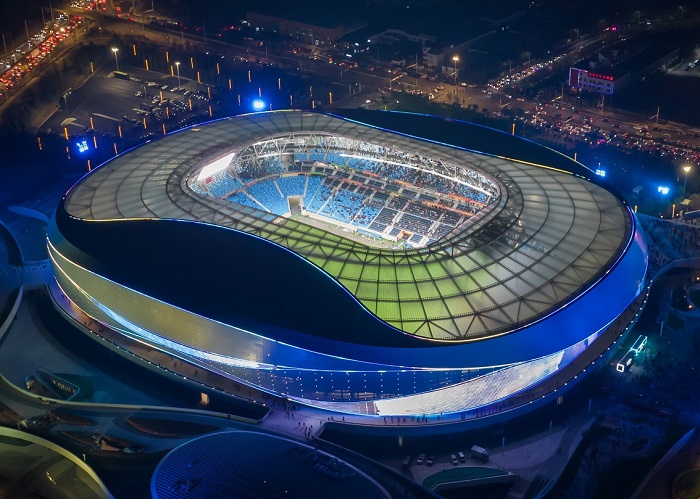 青島青春足球場是山東省首座五萬座專業足球場,滿足國際足聯國際A級比賽要求,是全國首個城站一體全民互動式公園化體育綜合體。青春足球場的設計靈感由海而來,取意“躍動海浪”。場館屋面外圈主體采用鋁鎂錳板勾勒塑造上下穿梭、飄逸流動的海浪造型,內圈則用透明輕盈的ETFE膜結構呼應青島優美的自然海岸風光,彰顯了青島開放、現代、活力、時尚的城市氣質。